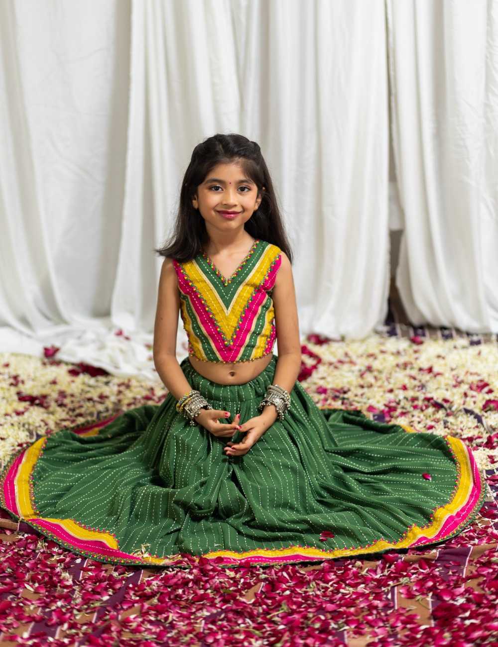 Bring festive energy to the dance floor with this lively green lehenga choli, perfect for Garba and Dandiya nights. The sleeveless V-neck choli features bold stripes in pink, yellow, and green embellished with delicate beadwork, giving it a bright and joyful look.