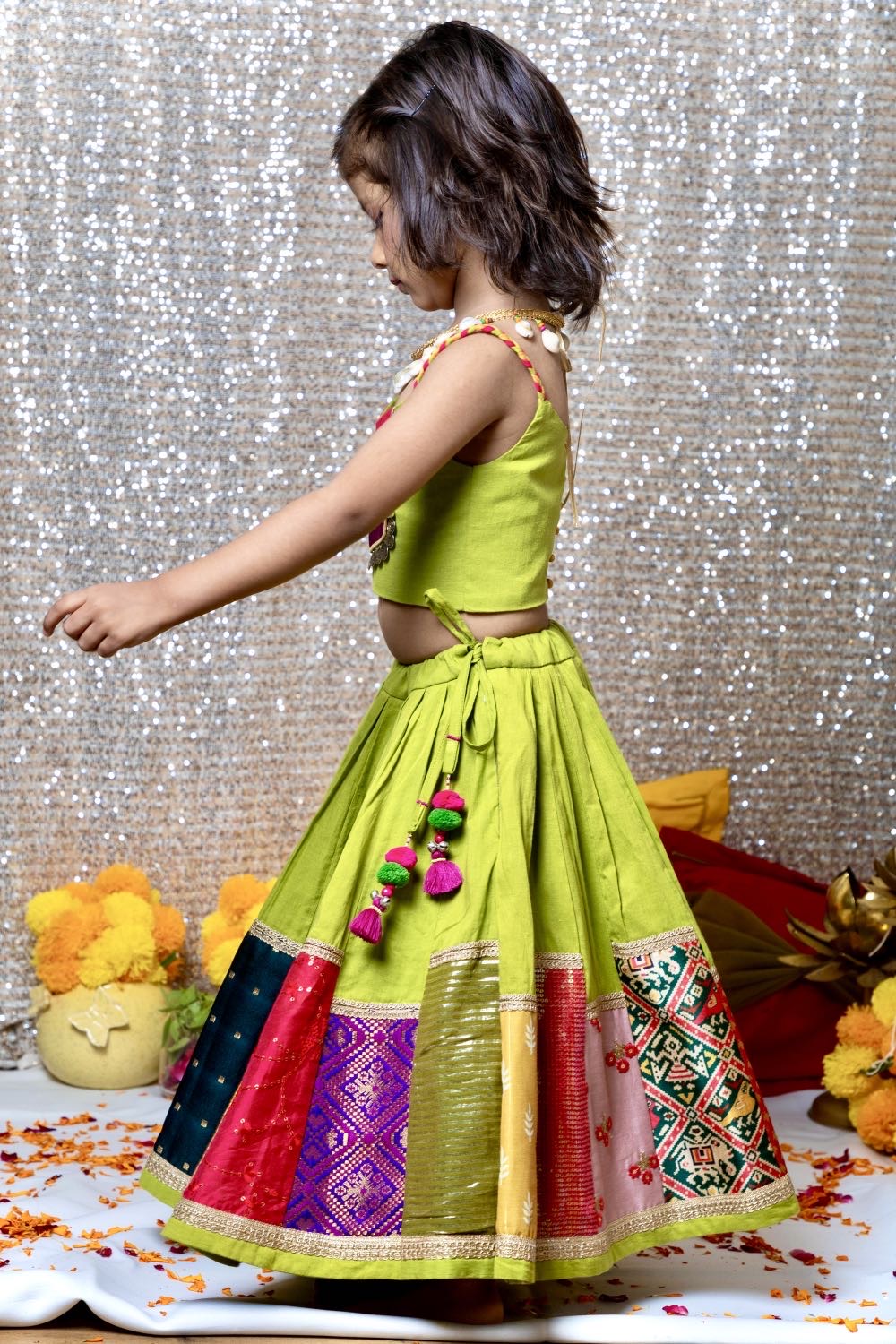 Parrot green lehenga with up down multicolour patchwork and lacework.
